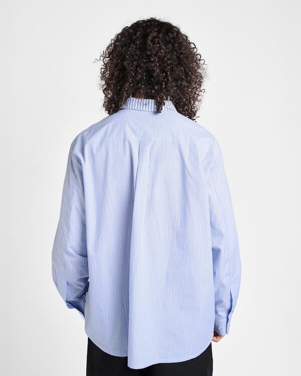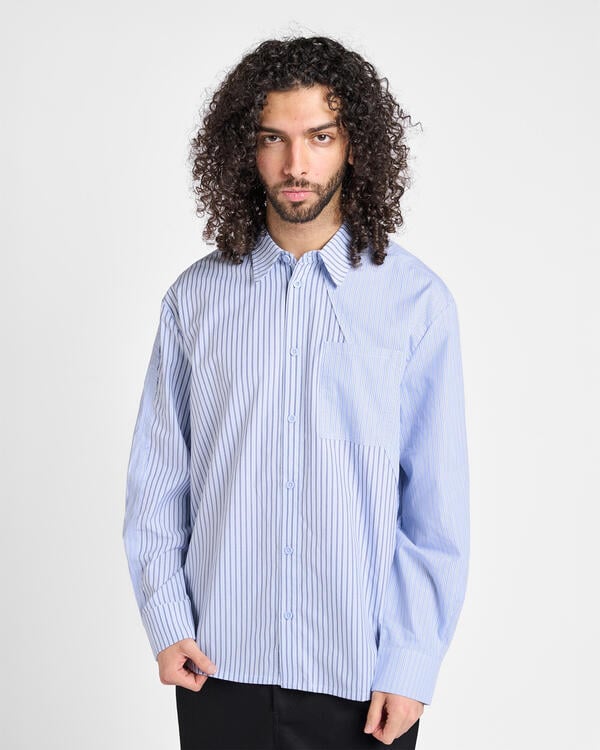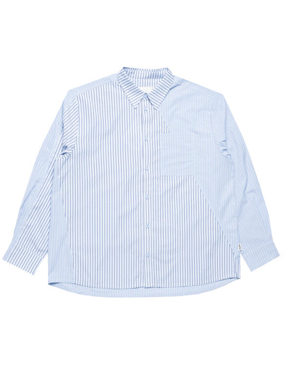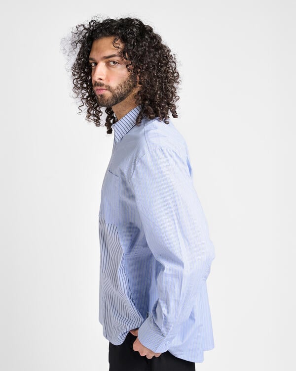 Crafted from premium cotton, the shirt is designed to channel the retrospective theme of the collection, combining two different striped patterns. Different seams run across the chest and sleeve, giving the blue-striped shirt a distorted look.