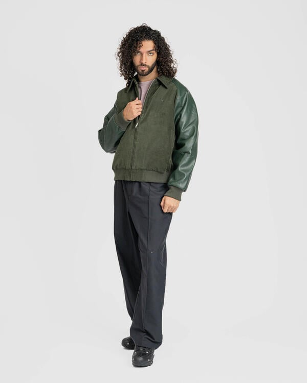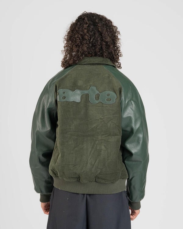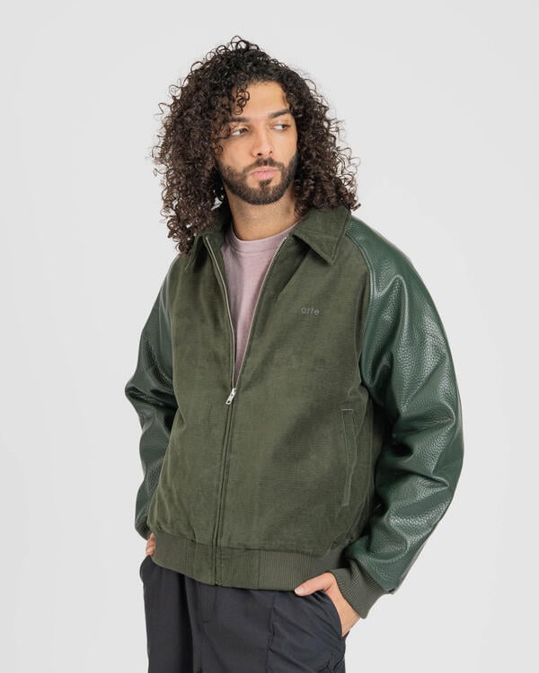 Designed in a faux leather and corduroy combination, this deep green colored jacket is a statement piece for every season. It offers effortless style, topped off with a green colored seasonal Arte leather logo patch on the back. The jacket has a zipper closure, two side pockets, elasticated trims and is finished with a tonal embroidered logo on the left of the chest.