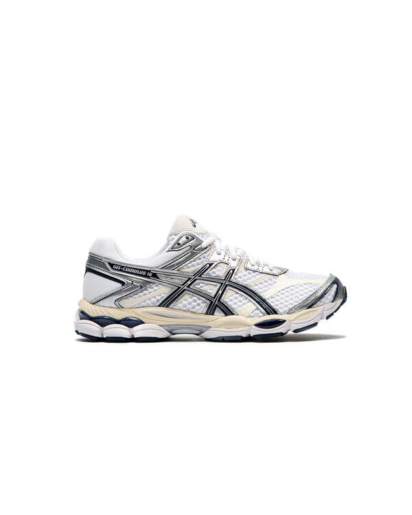 The GEL-CUMULUS 16eaker was first launched in 2014 and was previously known for its gentle cushioning when running longer distances. Its upper construction features a combination of glossy synthetic leather overlays, seamless inserts, and open mesh underlays. This fusion of materials creates a technical aesthetic that is symbolic of the advanced running shoes of the 2010s.