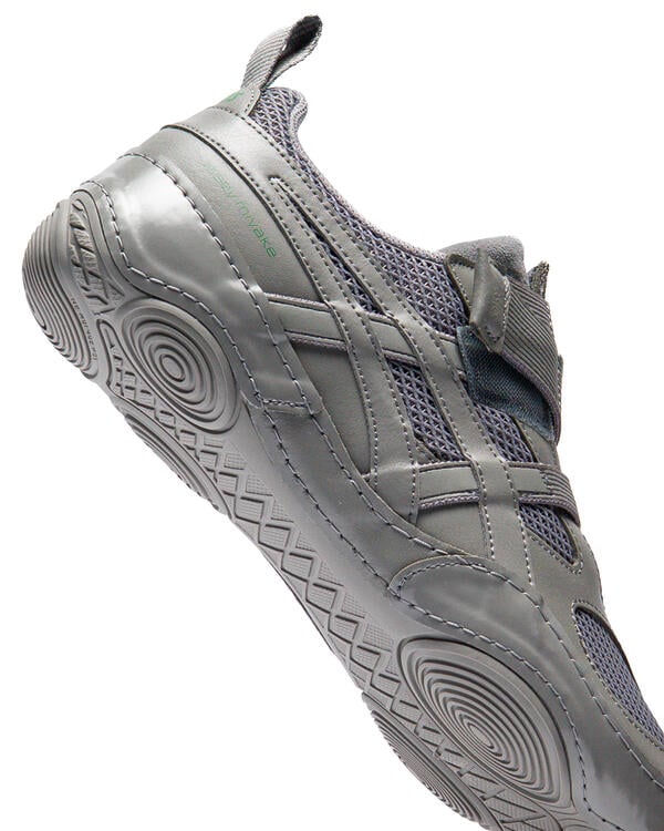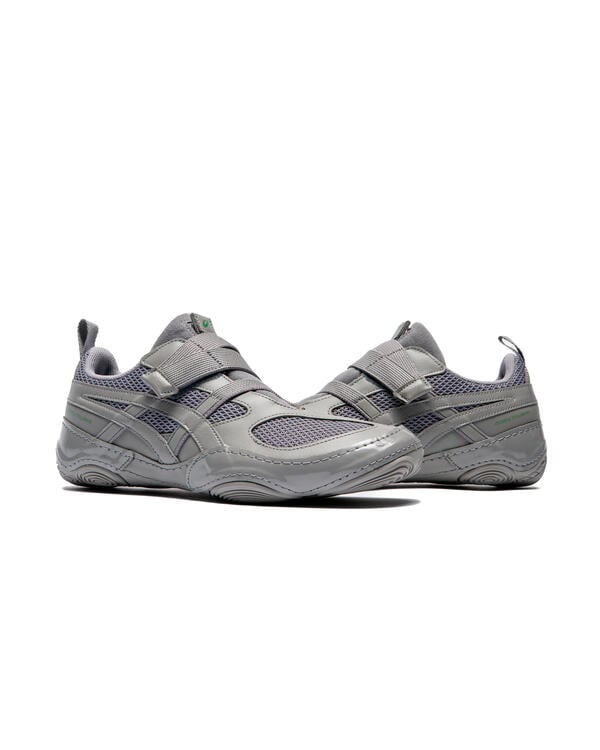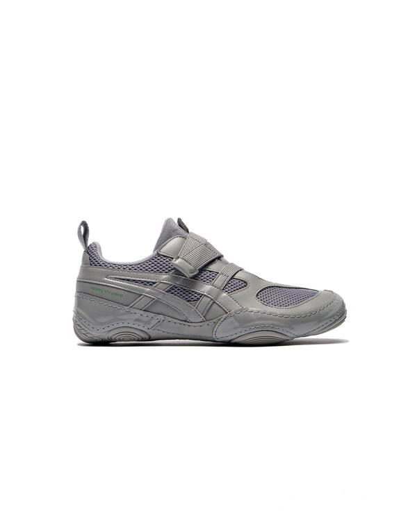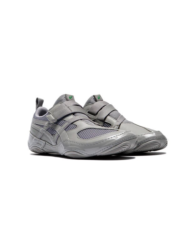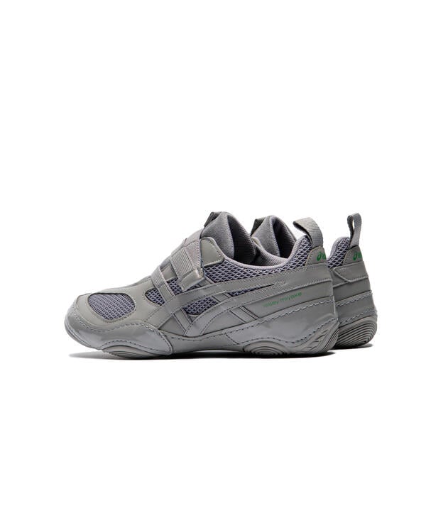 The upper features influences from the HYPERPOWER. A combination of smooth and ribbed leather is combined with shiny faux leather overlays and textured mesh inserts. These features are balanced by a criss-cross Velcro strap that is incorporated into the ASICS stripe logo on the sides.