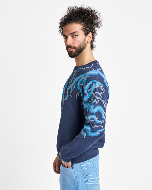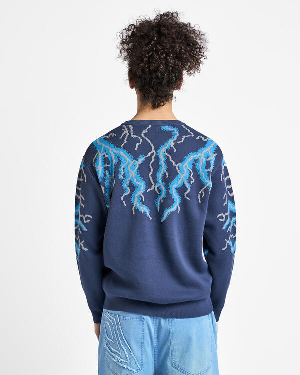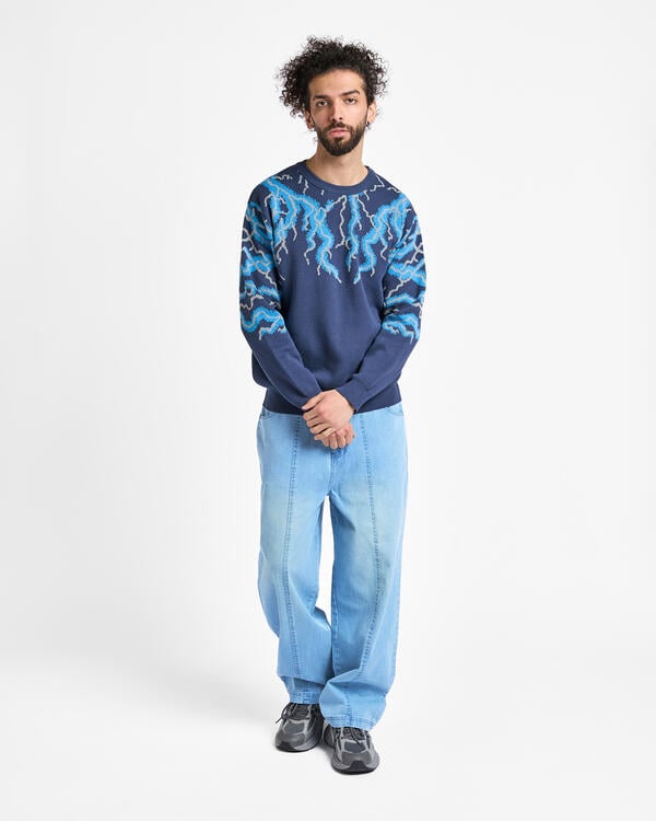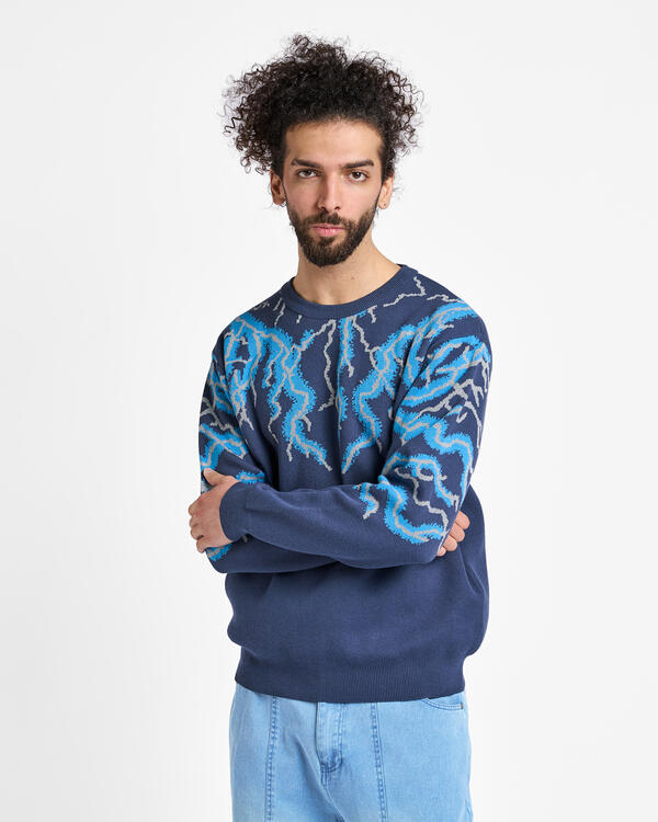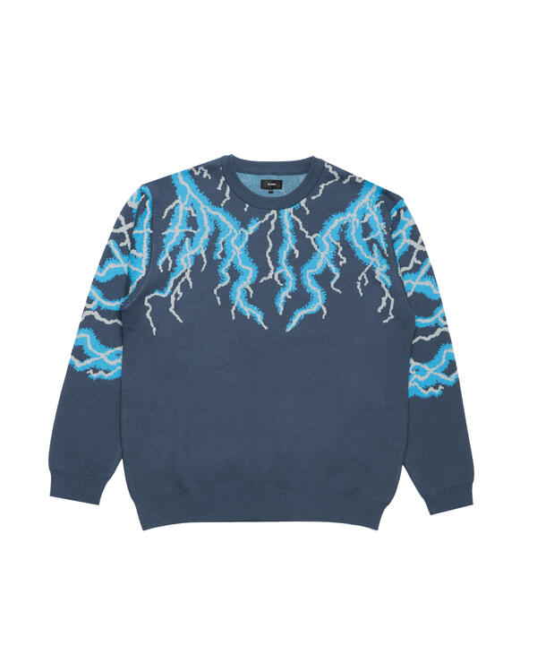 A crew neck knit with an eye-catching thunder pattern with an impactful thunder pattern. It is a piece with a strong presence that adds personality to your styling.