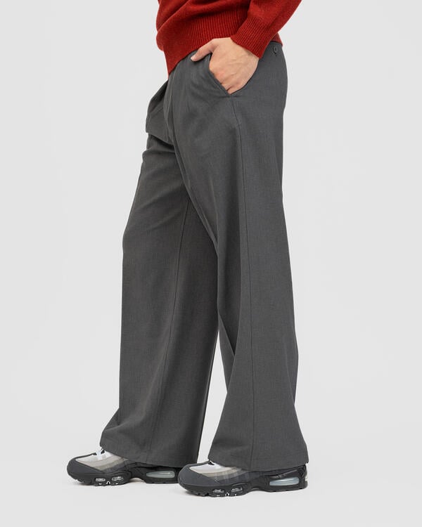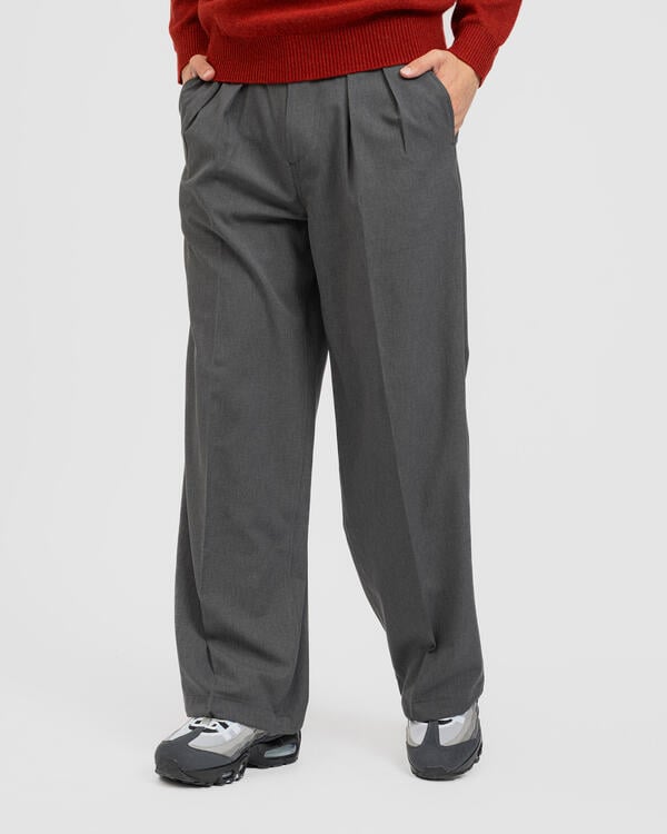 Wide slacks made from wool-like twill fabric. The design incorporates two pleats at the waist to create volume, while maintaining a sleek straight silhouette that drapes naturally to the hem. A center crease at the front and back adds a formal slacks-style finish, while an adjustable hem and a waist spindle allow for easy, belt-free wear and customizable shape.