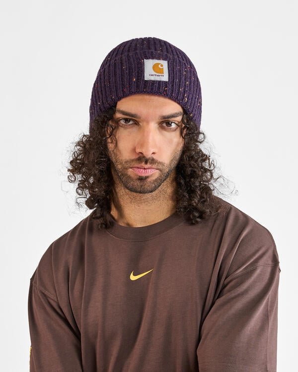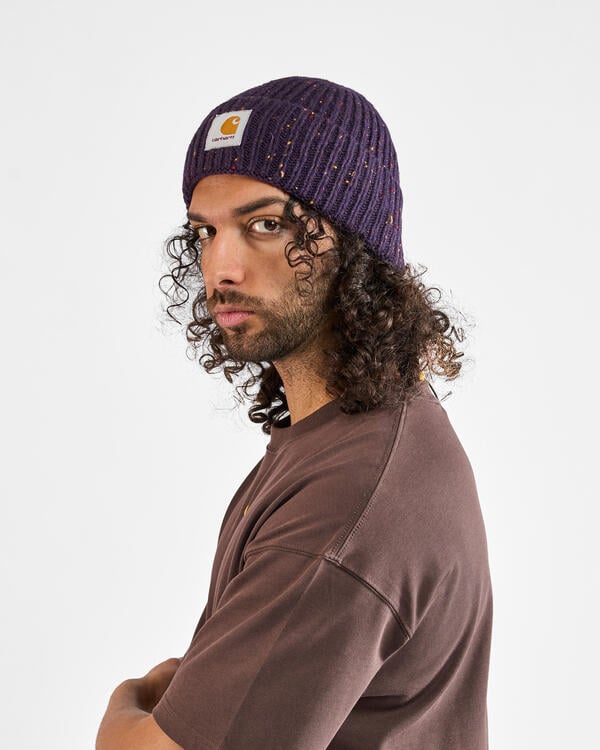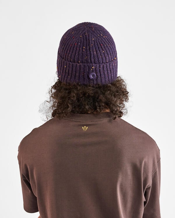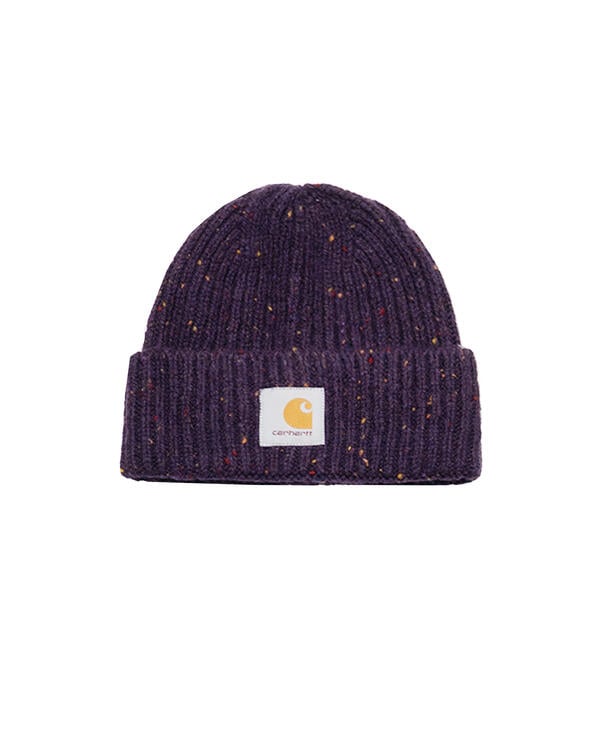 The Anglistic Beanie is made of lambswool, cotton, and acrylic yarn in an elastic rib knit and has a subtle speckled pattern. There is a woven square label on the front and a fixed faux horn button on the back.