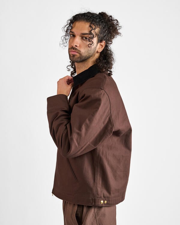 The classic Detroit Jacket is made from our well-known 340 g organic cotton Dearborn canvas. The jacket has a loose, untailored fit. It is lined with warm blanket fabric, has a corduroy collar, and features a classic woven “Carhartt WIP” label on the left chest pocket.