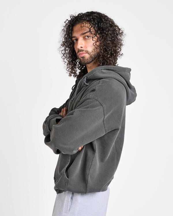 The Hooded Nelson Jacket is made from a heavy, unbrushed cotton jersey with a loopback construction. The style has a balloon fit that is slightly wider and boxier with dropped shoulders and ribbed cuffs. The jacket has been piece-dyed for a more complex color scheme and a softer feel. There is a woven square label on the left chest, which appears slightly duller due to the piece dyeing.