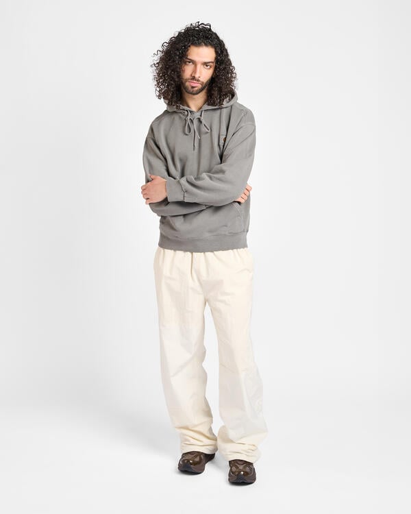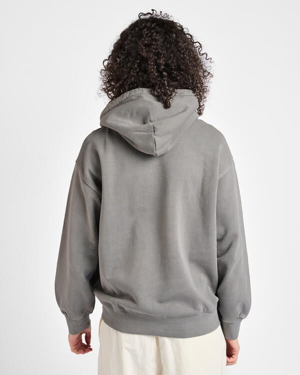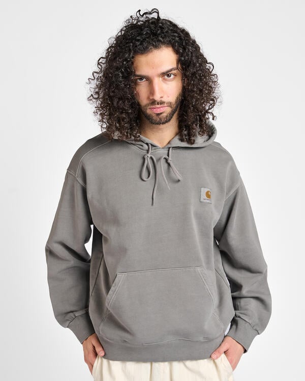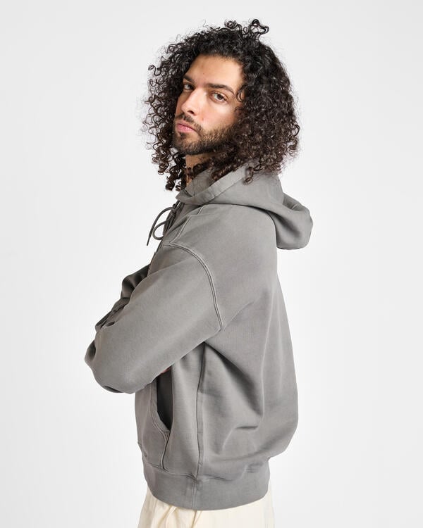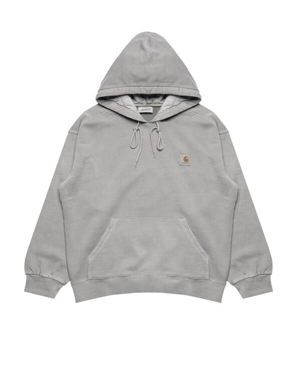 The Hooded Nelson sweatshirt is made from heavy, non-brushed cotton jersey. The material is pigment-dyed, giving it an intense coloration. With a kangaroo pocket and a diamond-quilted, softly lined hood. The sweatshirt is characterized by a distinctive, slightly wider “balloon cut” in a boxy style, dropped shoulders and ribbed cuffs. With a classic woven Carhartt WIP label on the left chest.