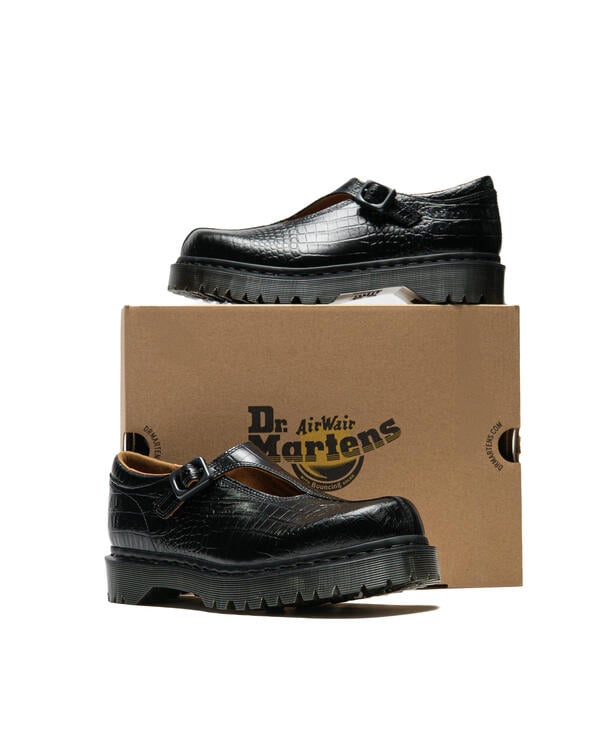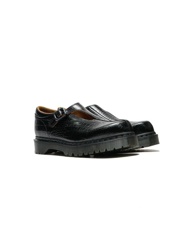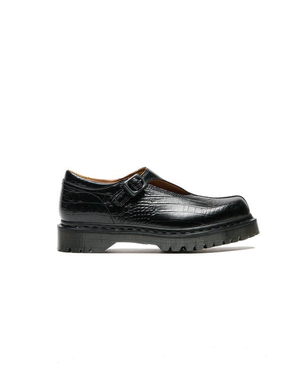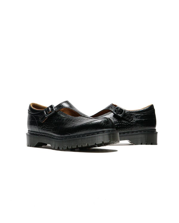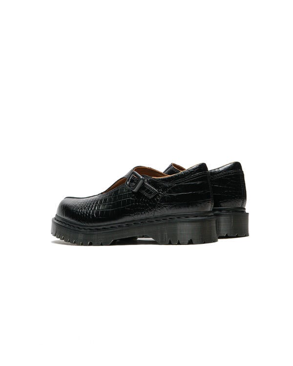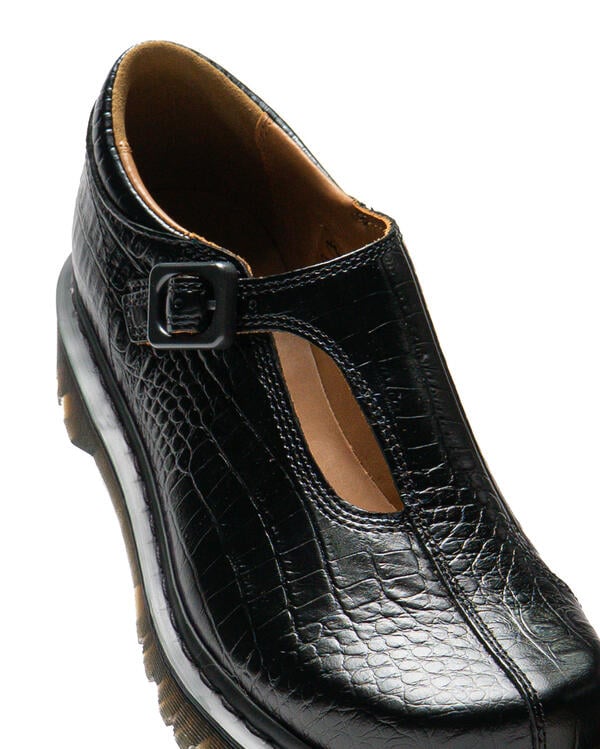 The Rejena Mary Jane shoe features a slightly angular toe area, giving it an interesting new shape. It is made of aniline leather with an embossed crocodile pattern. The asymmetrical shoe has a buckle and an off-center cutout, creating a sophisticated design. The shoe is rounded off by an extra-high, smoke-gray Bex sole with black frame stitching.