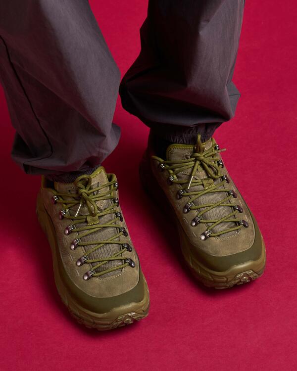The Tor Summit with its alpine silhouette pays homage to the classic hiking boot. Featuring HOKA's signature cushioning, the Tor has been reimagined with luxurious nubuck leather, a rubber mud guard, zigzag stitching and metal eyelets. The result? A good mix of trail vibes and urban design elements.