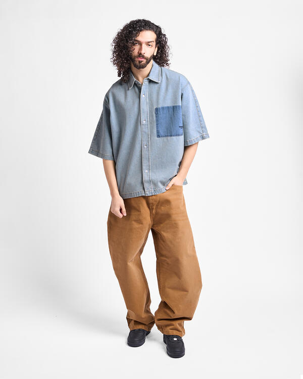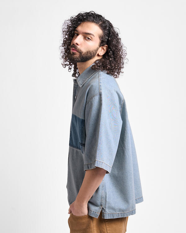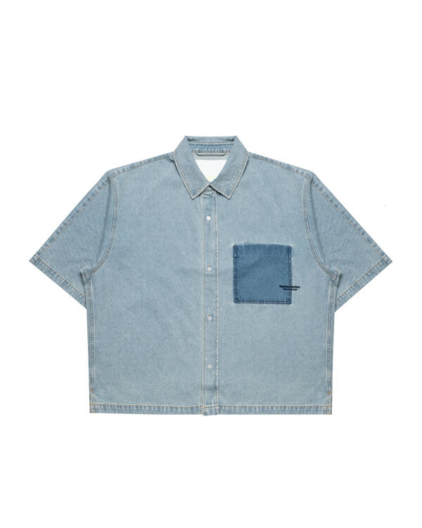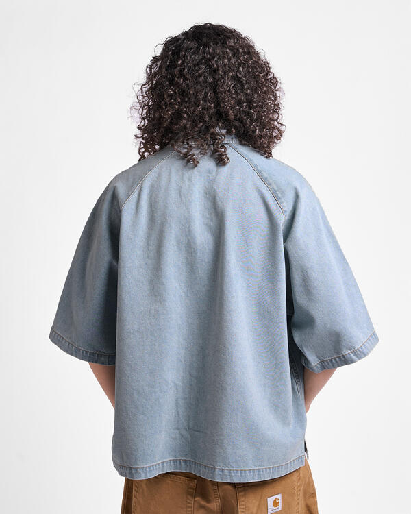 This raglan button-up shirt is cut to a relaxed unisex fit with dropped shoulders and a hip-length silhouette. It features a small name embroidery on the chest, an internal chest pocket, and a clean center-front button closure. Made from a soft washed cotton and lyocell blend, it offers a comfortable, lightweight feel.