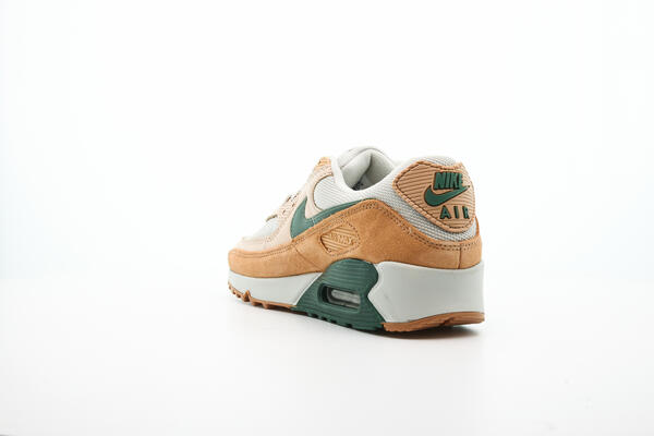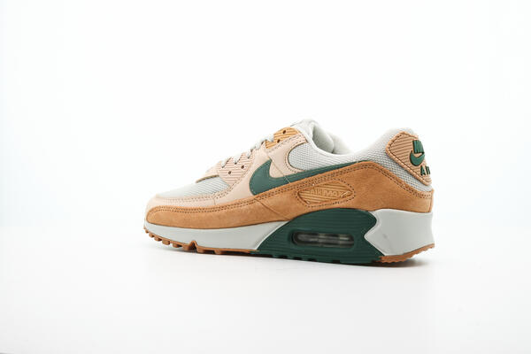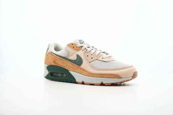 The Nike AIR MAX 90 PRM "LIGHT BONE" impresses with its pastel colorway and thus forms a perfect foundation for spring and summer. The mesh upper in light bone is the basis for the leather and suede overlays in "Dutch Green-Praline-Shimmer". Here, the "Dutch Green" is found on the Swoosh and the chamber reinforcement that frames and reinforces the Air window at the heel. The smooth leather overlays differ from the suede overlays because of the color, getting darker from the mesh.