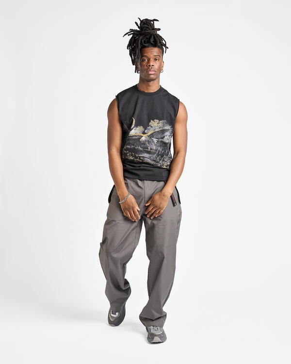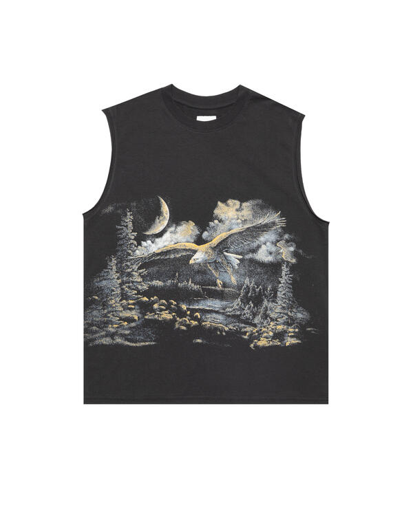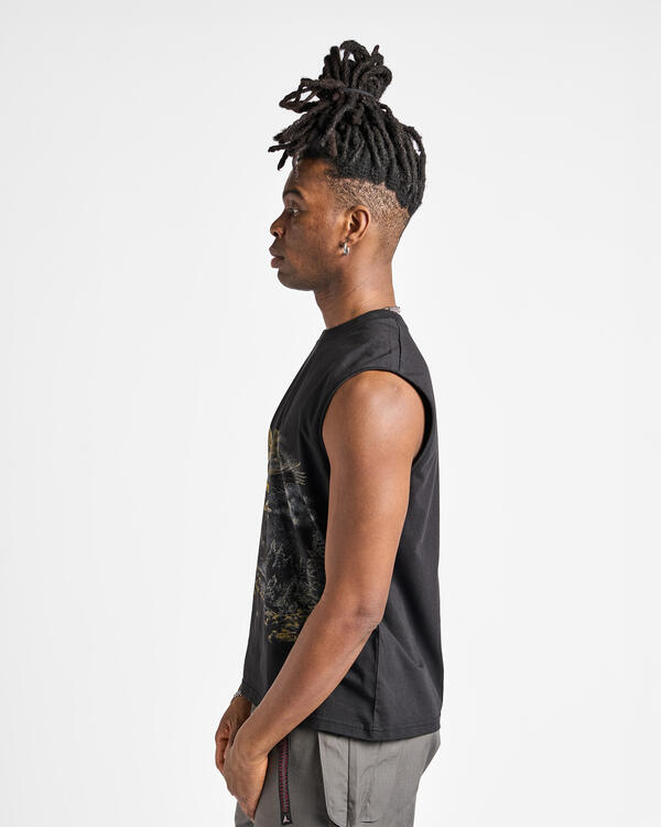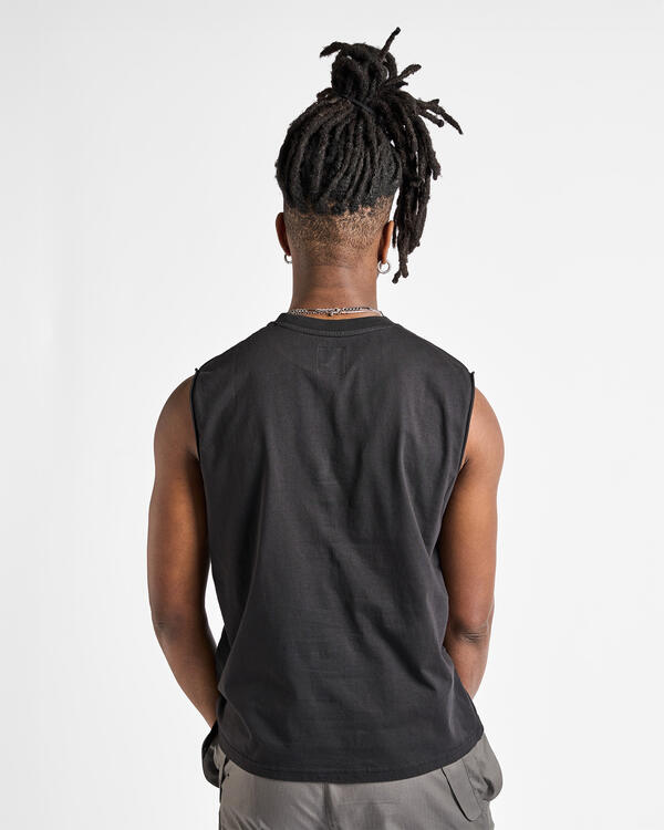 Sleeveless t-shirt made of organic cotton jersey, washed black color. Boxy and comfortable fit. Very soft, lightweight, and breathable fabric. Printed contrasting graphic on the front. Ribbed collar.