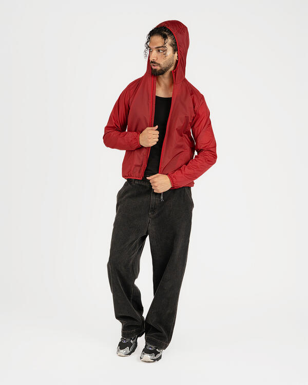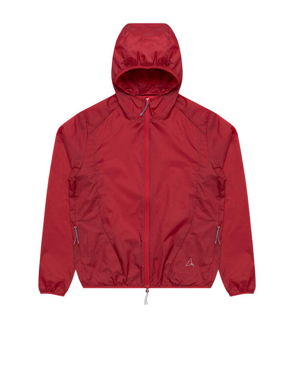 Lightweight hooded windbreaker in burgundy color. Extremely lightweight transparent micro ripstop nylon with lasered details. Close fit. Packable for easy use and storage. Centerline zipper opening and two front pockets.
