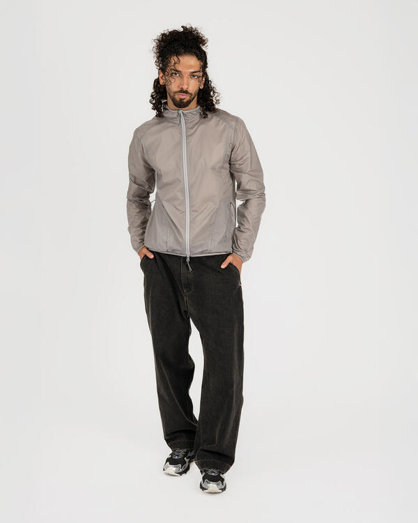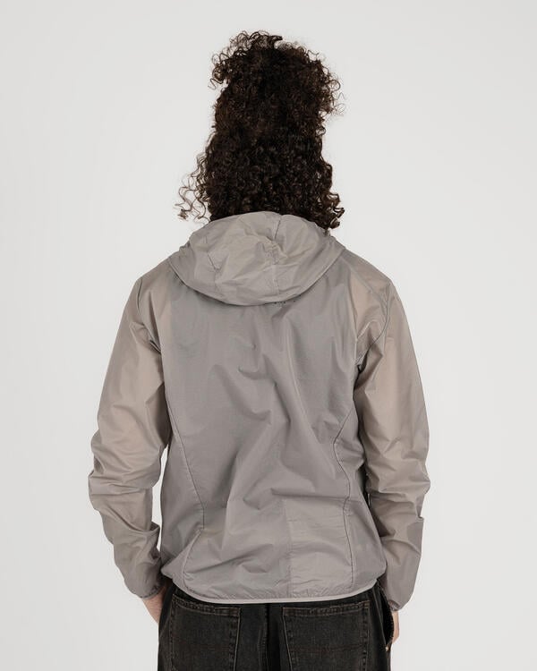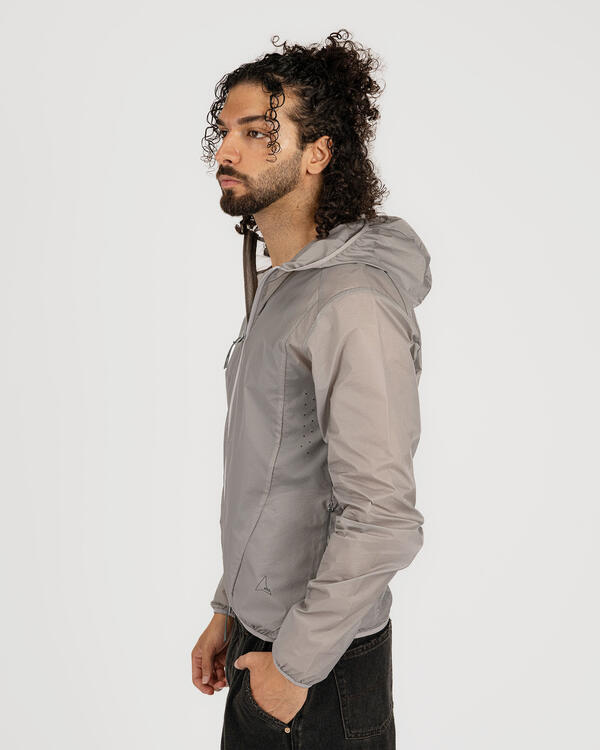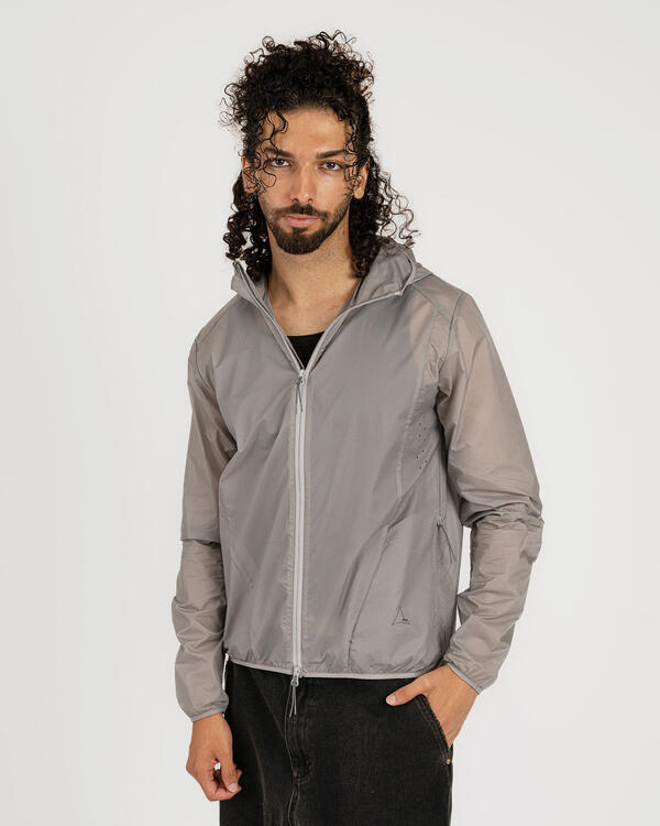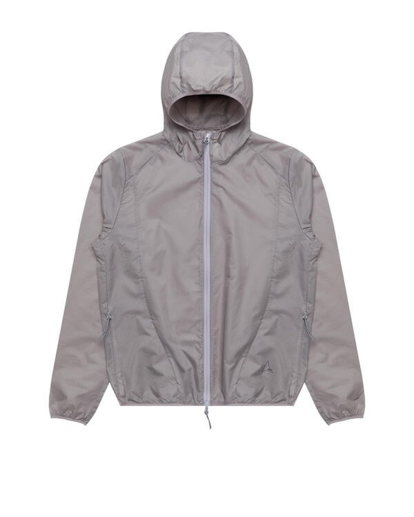 Lightweight hooded windbreaker in burgundy color. Extremely lightweight transparent micro ripstop nylon with lasered details. Close fit. Packable for easy use and storage. Centerline zipper opening and two front pockets.